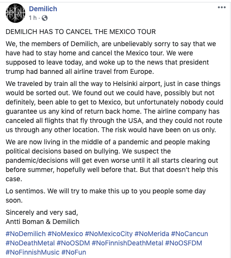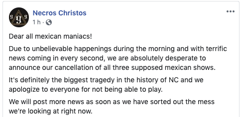Esta mañana los organizadores informaron mediante un comunicado, que las bandas Necros Christos, Demilich, Galvanizer e Imprecation cancelaron su participación debido a las medidas de seguridad que han tomado países como Estados Unidos quienes el día de ayer suspendieron todos los vuelos provenientes de Europa, muchos de ellos harían escala ahí para llegar hasta México, por tal motivo no será posible que estén en esta edición pero estamos seguros que pronto se re programará su visita ya que esta situación sale completamente de las manos de los organizadores quienes hicieron todo lo posible hasta el último momento para que se llevara a cabo de manera excelente y sin contratiempos como en los años anteriores.