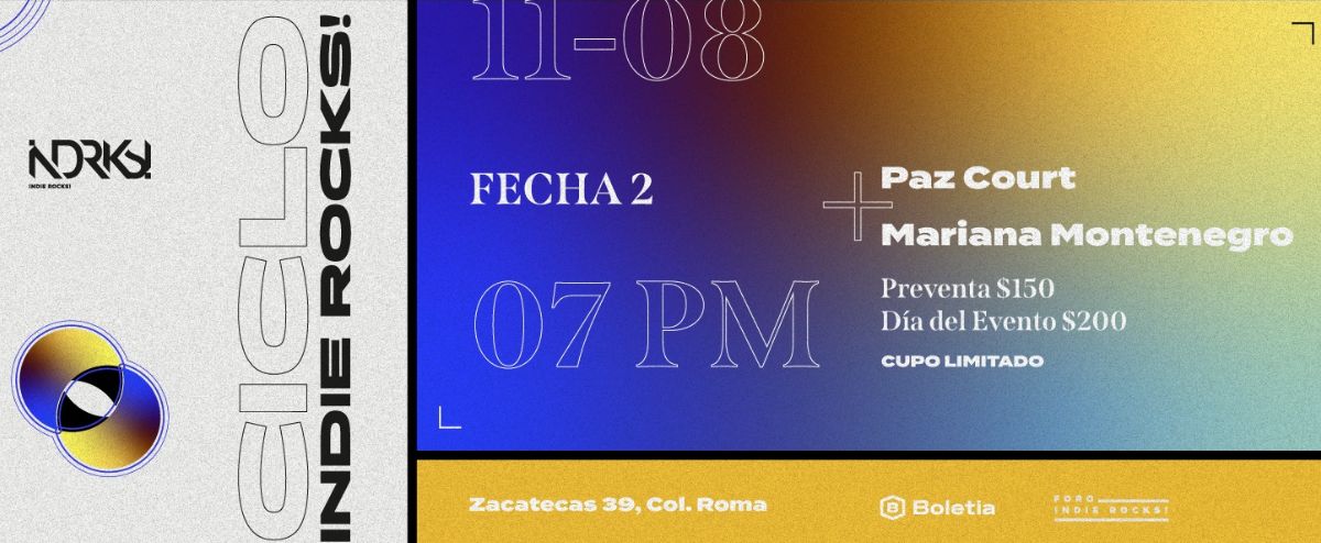 Después de que el dúo Dënver se desintegrara, Mariana Montenegro siguió camino en solitario como compositora y DJ. Este año, la cantante vuelve al Foro Indierocks! para presentar La Mar, su primer álbum solista, una mezcla de Disco, R&B y New Wave que explota la música bailable y su aterciopelada e icónica voz. Para coronar esta noche efervescente Paz Court estará presentando La Fuerza, su último disco, donde se aleja de los ritmos festivos que la caracterizan para explorar su costado más introspectivo a través de una peculiar fusión entre el folclore, el rock y la música electrónica.