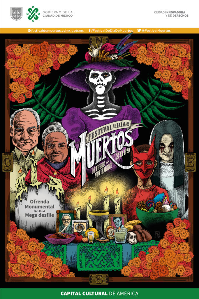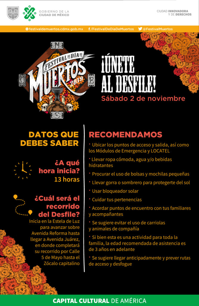 Con la Mega Procesión de Catrinas, la exhibición de la Ofrenda Monumental “Altar de altares”, el Desfile Internacional de Muertos y el Mega Desfile de Día de Muertos, entre otras actividades, el Festival de Día de Muertos 2019 revitalizará la riqueza expresiva de la tradición con más arraigo en el país, al tomar del 19 de octubre al 17 de noviembre diversos espacios de la Ciudad de México.