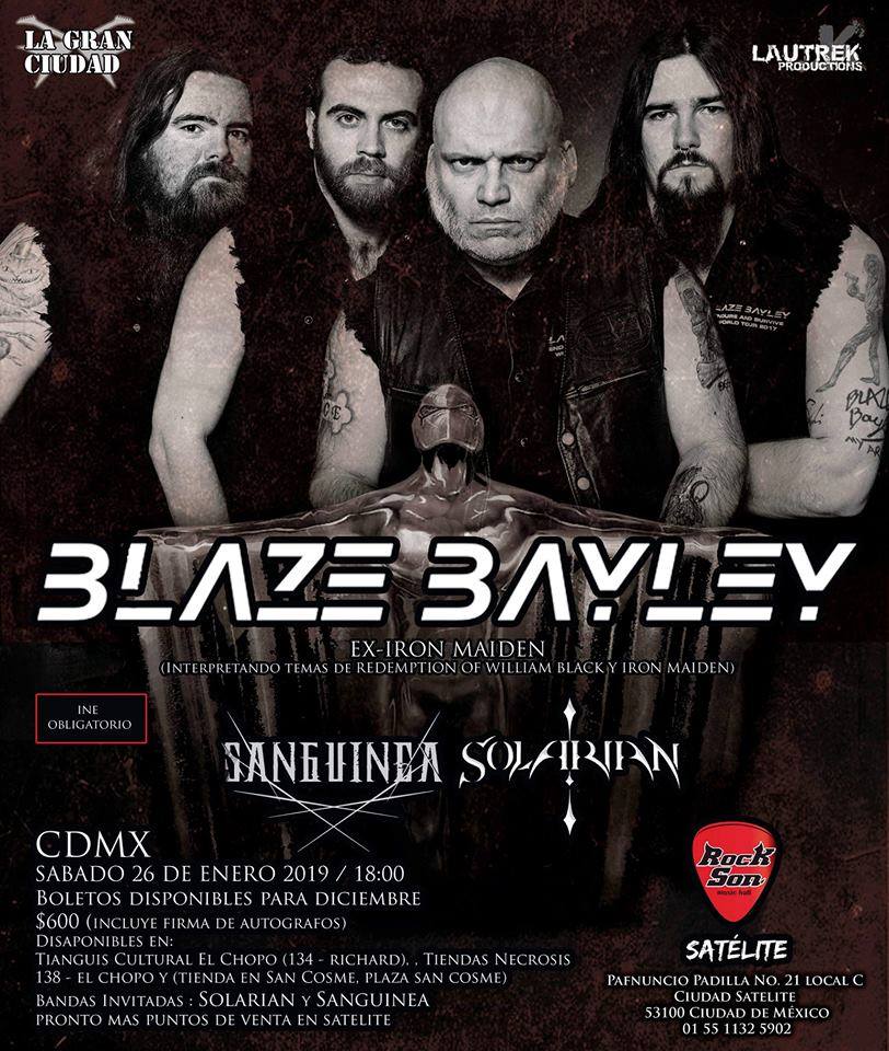 Blaze Bayley ex vocalista de Iron Maiden visita por segunda vez Mexico, en esta ocasión viene acompañado de su banda, ya que en otras visitas a nuestro país se ha presentado con una banda soporte local. Interpretaran temas de su nuevo disco y clásicos de la leyenda Iron Maiden. Recordemos que Blaze grabó dos álbumes con la legendaria banda Iron Maiden, nos referimos al The X Factor y Virtual XI de donde se desprenden grandes temas como Sign Of The Cross, Man On The Edge, Futureal, The Clansman, entre otras, mismas que aún son interpretadas en los conciertos de la banda. Seguramente serán parte del setlist de este concierto, así que es tu oportunidad de escucharlas en con la voz original. Además como bandas teloneras se presentan: Solarian, Sanguinea y The Ripper.